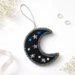 Beaded Moon Charm is a beautifully handcrafted decorative accent designed to bring a celestial touch to your space. Featuring a crescent moon silhouette, this ornamental piece is intricately adorned with dense black beadwork that creates depth, texture, and visual richness. The design is elevated with carefully placed blue crystal stones, soft pearl accents, and iridescent star-shaped embellishments that reflect light subtly, enhancing its overall appeal. The combination of dark bead detailing with multicolor outer beading gives this Beaded Moon Charm a striking contrast that stands out in both minimal and festive environments.