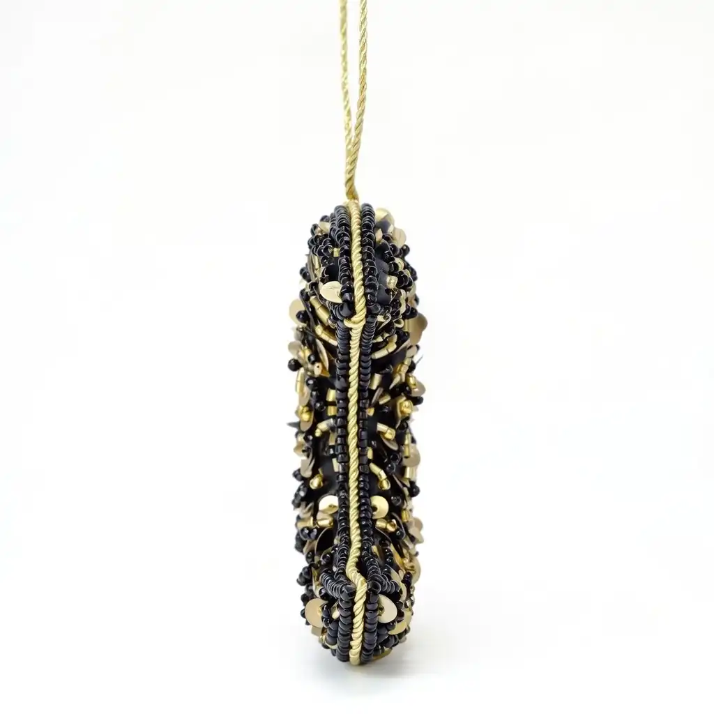 The structured design allows the ornament to maintain its form while sustaining a dense amount of surface beadwork. Its color palette of black and gold offers flexibility for contemporary interior styling, event setups, and themed decorative compositions. This half moon ornament is a practical décor accessory that elevates visual richness with minimal effort and blends seamlessly into modern, traditional, boutique or premium décor spaces.