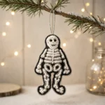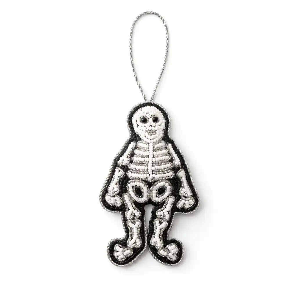 Beaded Skeleton Hanging Ornament is a distinctive decorative piece designed to bring bold contrast and handcrafted detailing into festive and themed décor setups. Crafted with precise bead embroidery, this ornament features a structured skeleton silhouette highlighted in white beadwork against a black bordered outline. The defined bone detailing, including rib structure, skull shape, and limb contours, is carefully stitched to create a balanced and visually striking ornament suitable for seasonal decorations and creative styling themes.