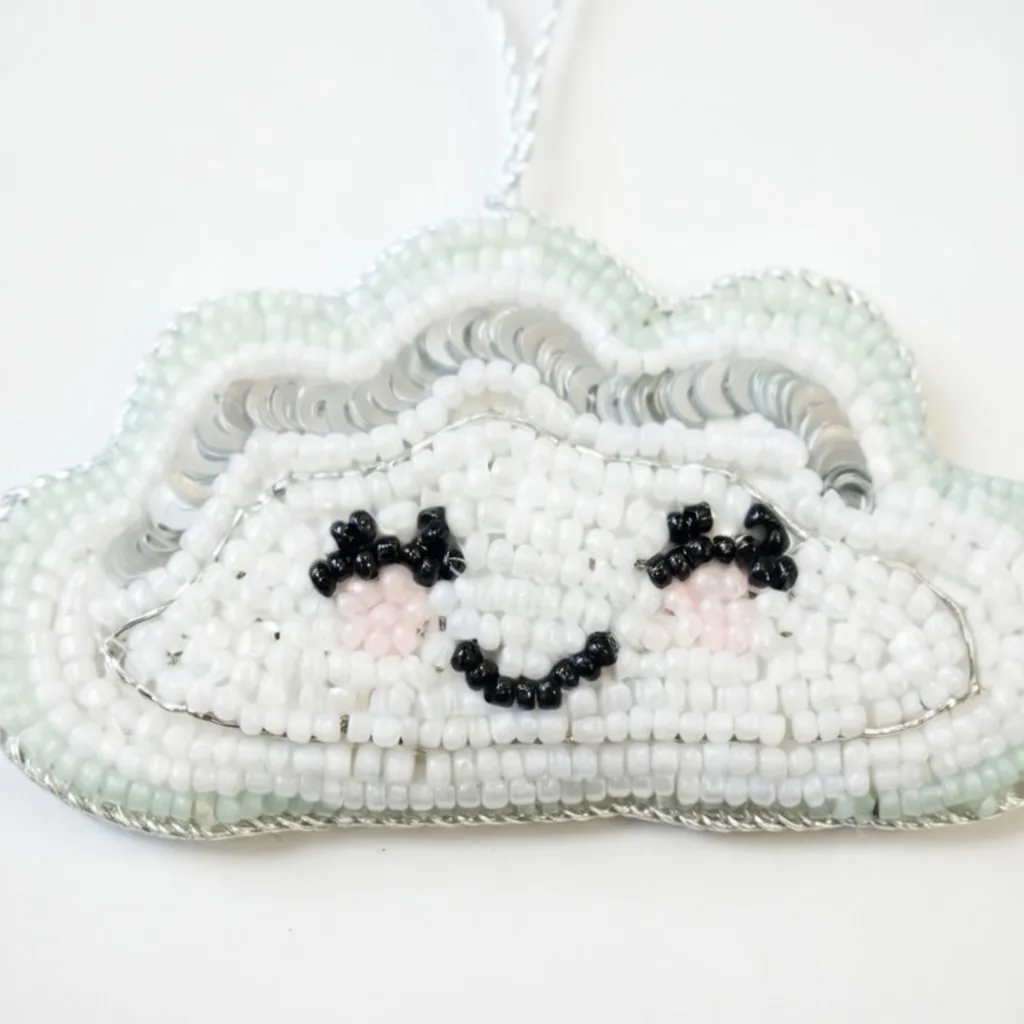 Cloud ornament decorations have become a popular choice for nursery environments, children’s room aesthetics, seasonal gifting, and whimsical visual displays. This white beaded cloud ornament stands out due to its playful expression, soft color tones and handcrafted bead detailing that creates an elegant yet cheerful appeal. The white beads combined with subtle blush detailing and black facial accents give the ornament a charming personality suitable for a wide range of décor settings beyond just seasonal festivities.