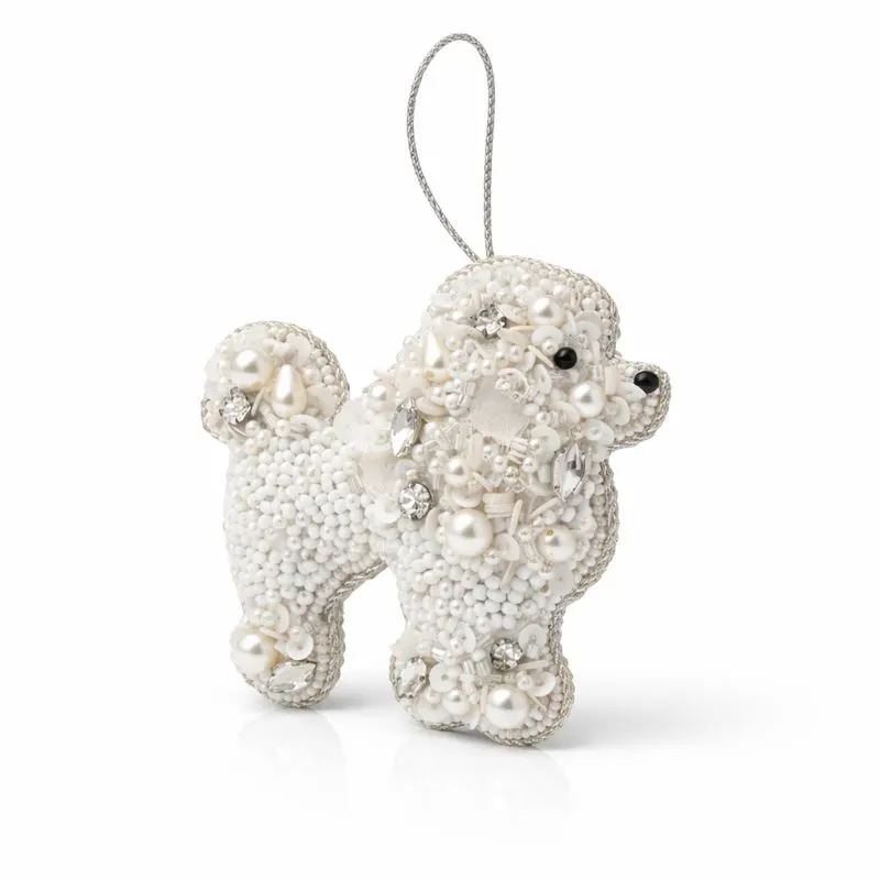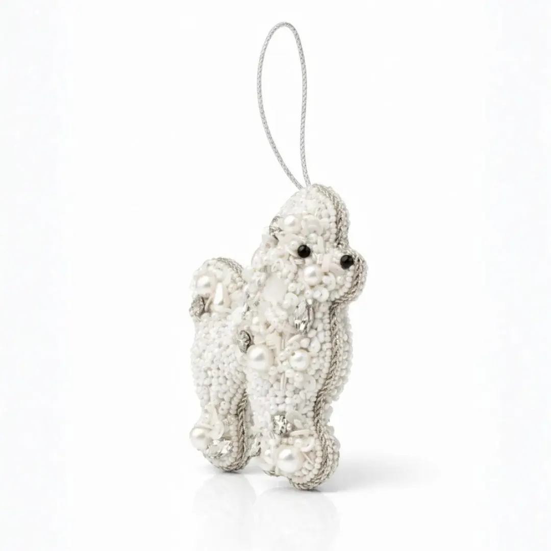 This white beaded dog ornament is completely handmade by skilled artisans who specialize in traditional beadwork techniques. Each bead is carefully stitched by hand onto a soft felt base, ensuring durability without compromising visual appeal. The raised bead texture gives the ornament a rich, dimensional appearance, while the pearls and crystal stones add gentle shine without overwhelming the design. Because it is handcrafted, every beaded dog ornament carries slight variations that enhance its authenticity and uniqueness.