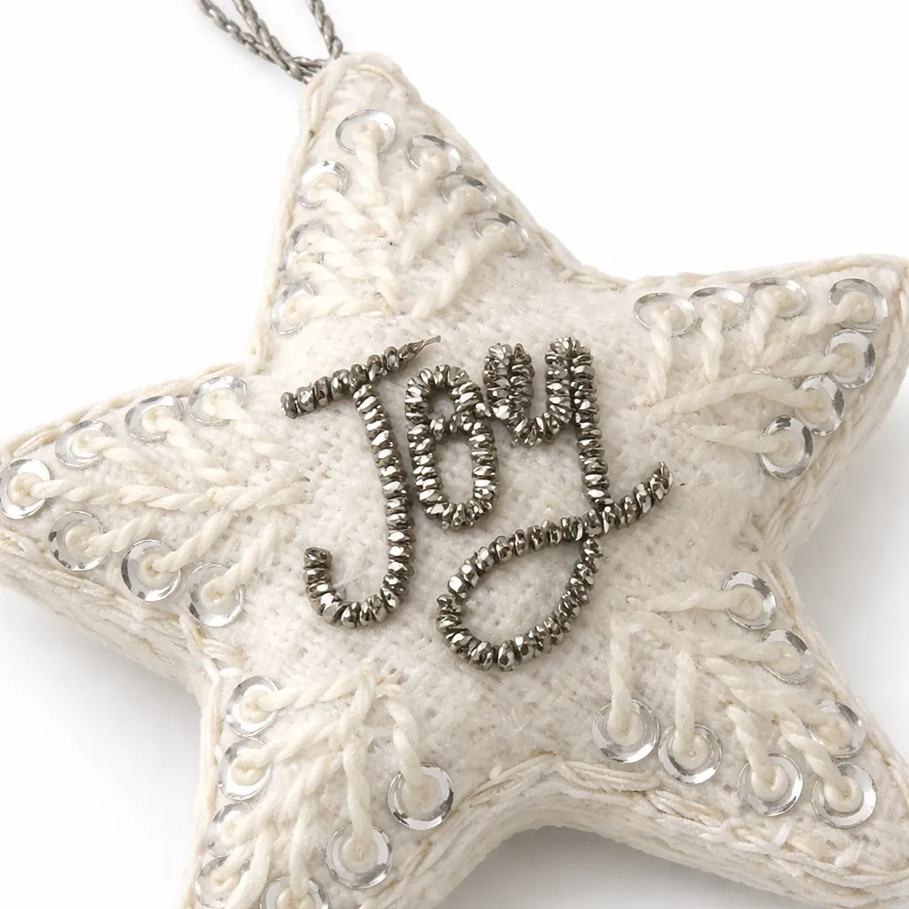 Beaded Star Hanging is a beautifully handcrafted decorative accent designed to add elegance and subtle festive warmth to any space. Crafted in a soft white base, this Beaded Star Hanging features intricate thread embroidery paired with delicate bead detailing that enhances its textured appearance. The five-point star silhouette offers a balanced and symmetrical look, making it ideal for festive décor, celebration settings, and refined home styling. At the center, a metallic beaded Joy embellishment creates a distinctive focal point that complements the soft white texture without overpowering the overall design.