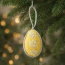 Beaded Egg Ornament crafted in a vibrant yellow tone brings refined festive charm to your home decor collection. Designed with precision bead embroidery, this decorative piece features closely arranged yellow seed beads that form a smooth and consistent egg-shaped structure. The symmetrical white and yellow floral bead motifs positioned vertically across the surface enhance its visual appeal while maintaining a clean, balanced design. The silver braided hanging loop adds a subtle contrast and ensures durability for repeated seasonal use.